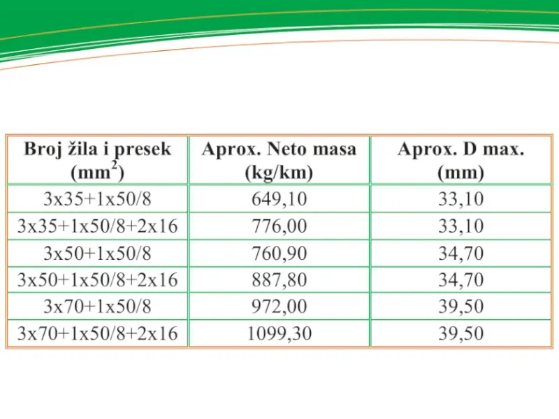 Samonosivi kablovski snop bez noseceg užeta Nazivni napon: 0,6/1kV Konstrukcija provodnika: Aluminijum Tip: XP00-A Opseg radne temperature: -20°C do +90 °C Opseg temperature polaganja: +0°C do +50 °C