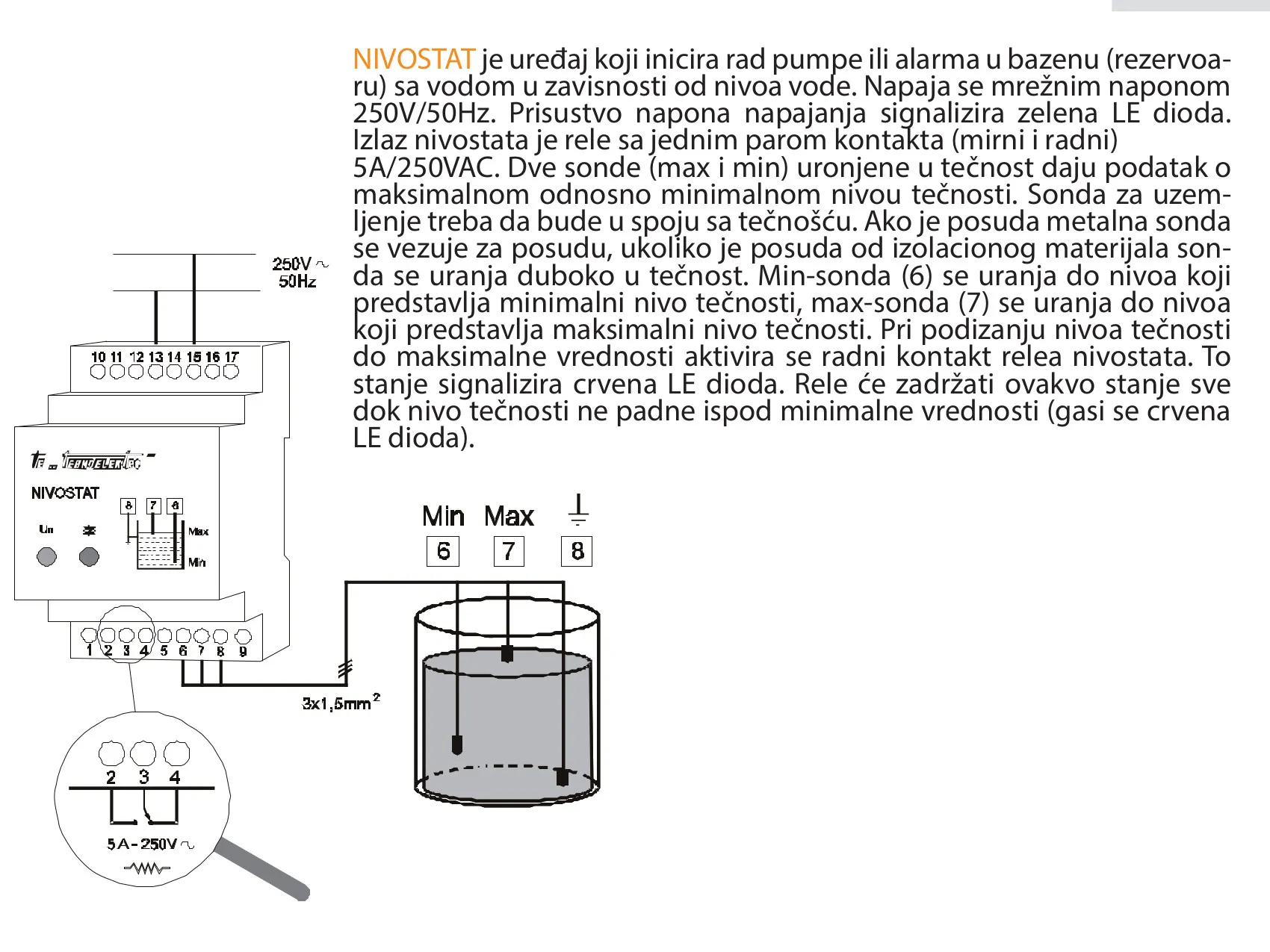 Primena: Regulacija nivoa elektricno provodne vode u rezervoarima, bazenima i alarmiranje min i max nivoa tecnosti Napajanje: 250V AC Izlaz: 1xU 8A/250V AC Napon na sondi: <10V AC Montaža na DIN-šinu Dimenzije kucišta (mm): 53x90x71.5 Nivostat je uredaj koji inicira rad pumpe ili alarma u bazenu (rezervoaru) sa vodom u zavisnosti od nivoa vode. Dve sonde (max i min) uronjene u tecnost daju podatak o maksimalnom odnosno minimalnom nivou tecnosti. Sonda za uzemljenje treba da bude u spoju sa tečnošću. Ako je posuda metalna sonda se vezuje za posudu. Ako je sonda od izolacionog materijala, sonda se uranja u tecnost.